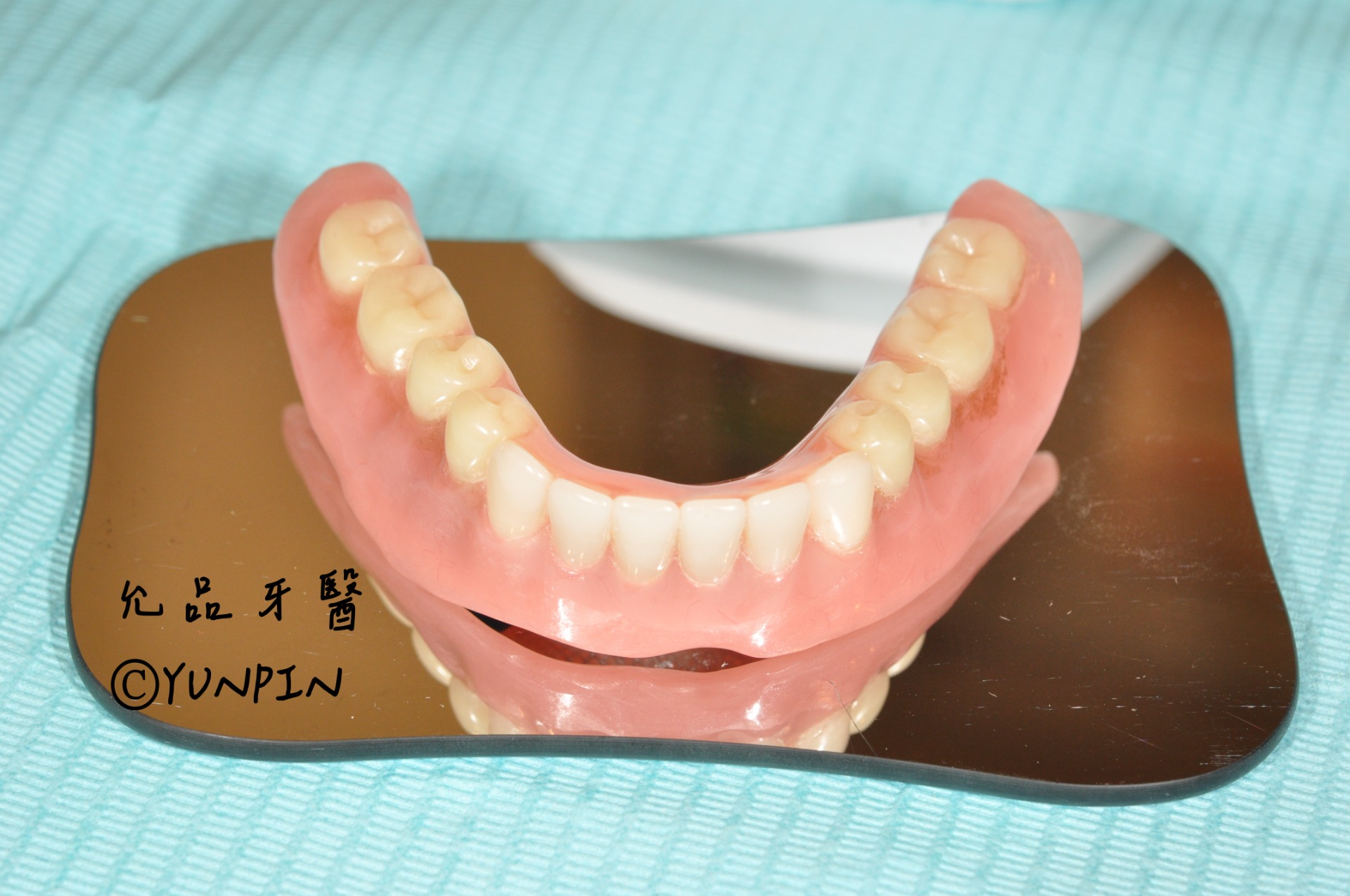 圖片中下排利用植牙與牙床相應位置於下頷植入兩個植體支撐覆蓋型的活動假牙,